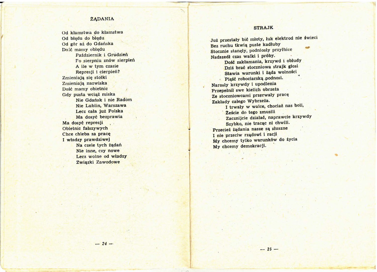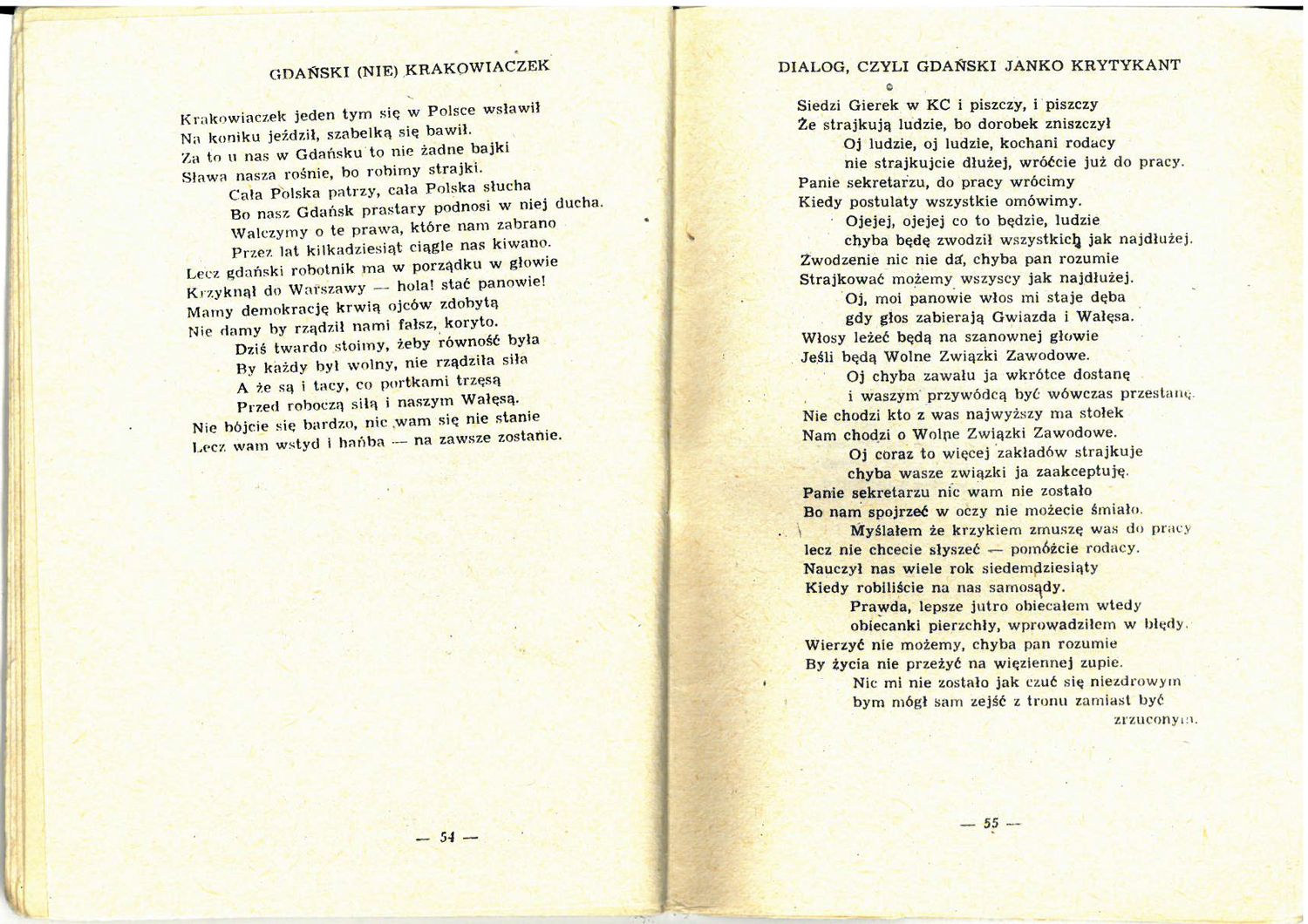 Twórczość, która nawiązywała do wydarzeń sierpniowych była bardzo różnorodna. Powstawały wiersze wartościowe, a nawet wybitne, pisane przez niewątpliwie utalentowanych autorów (Do  niektórych utworów szybko powstawały melodie. Bodaj najbardziej znanym przykładem tego rodzaju inspiracji jest wykorzystana w filmie Andrzeja Wajdy „Człowiek z żelaza” „Piosenka dla córki” poety Krzysztofa Kasprzyka, do której muzykę skomponował Maciej Pietrzyk). Obok nich rozpowszechniano wiele tekstów amatorskich, często nazbyt emfatycznych, zawierających dość banalne rymy, kreślonych bez zwracania uwagi na metrum i na pewno w pośpiechu, które trudno zaliczyć do arcydzieł. Również i te utwory bywały śpiewane, ale zazwyczaj na melodie znanych powszechnie hymnów, pieśni czy piosenek rozrywkowych. Jedne i drugie, niezależnie od oceny ich wartości literackiej, odzwierciedlają poglądy, uczucia i emocje autorów. Po latach przybliżają czytelnikom atmosferę Sierpnia i również dlatego zasługują na przypomnienie. Oto niektóre z nich, zawarte w przechowywanym w archiwum Oddziału IPN we Wrocławiu, drugoobiegowym zbiorze wydanym w grudniu 1980 roku przez Bibliotekę Historyczną i Literacką.