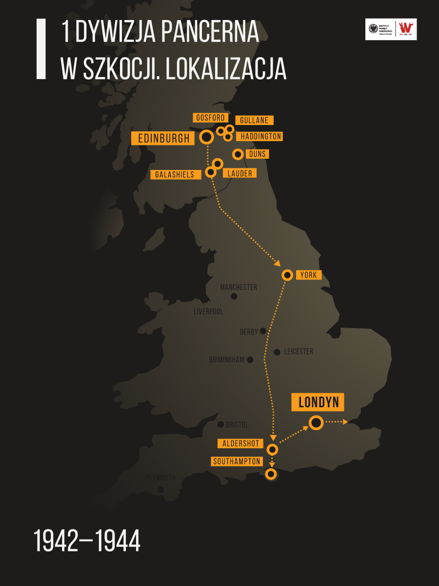 1. Dywizję Pancerną, powstałą na rozkaz Naczelnego Wodza gen. broni Władysława Sikorskiego z 25 lutego 1942 r., sformowano na podstawie jednostek wydzielonych ze składu I Korpusu Polskiego w Wielkiej Brytanii: 10. Brygady Kawalerii Pancernej, 16. Brygady Czołgów, Dywizjonu Rozpoznawczego Korpusu, 1. Batalionu Ciężkich Karabinów Maszynowych Korpusu, Batalionu Saperów Korpusu. Początkowo pododdziały Dywizji przeznaczono do ochrony wschodniego wybrzeża Szkocji przed spodziewanym niemieckim desantem. Koszary urządzono w miejscowościach południowej części Szkocji: Galashiels, Gosford, Gullane, Duns, Lauder i Haddington. Szkolenie prowadzono na sprzęcie brytyjskim, używając czołgów Valentine, Crusader i Churchill. Stan liczebny 1. Dywizji Pancernej wynosił w początkowym okresie: 885 oficerów, 15210 podoficerów i żołnierzy, 381 czołgów, 473 działa oraz 5060 pojazdów mechanicznych różnego przeznaczenia. Gdy do wojny przystąpiły Stany Zjednoczone, do Wielkiej Brytanii trafił także amerykański sprzęt pancerny i wówczas przezbrojono część pododdziałów dywizji w czołgi M4 Sherman (1., 2. Pułk Pancerny, 24. Pułk Ułanów), w innych zaś posługiwano się nadal sprzętem brytyjskim (10. Pułk Strzelców Konnych używał czołgów Cromwell). W lipcu 1944 r. przeniesiono Dywizję do obozu w Aldershot, skąd wkrótce miała zostać wysłana do Normandii, gdzie alianci toczyli zacięte walki przeciwko wojskom niemieckim.
