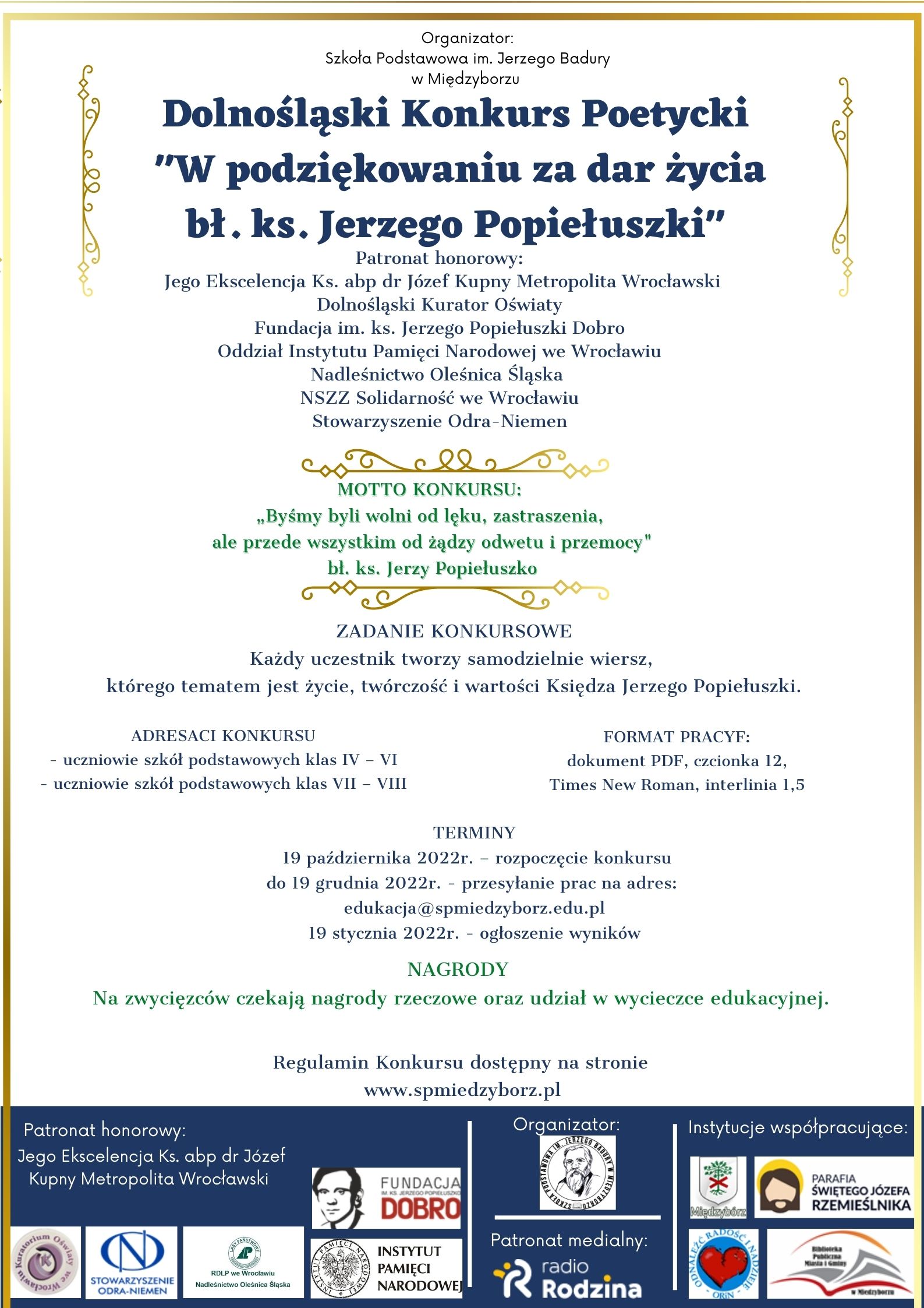 Ponadto rywalizacja konkursowa, poprzez możliwość prezentacji swoich umiejętności przy wykorzystaniu technologii informacyjnych, ma na celu umacnianie wśród uczniów wiary w siebie oraz rozbudzanie zainteresowania twórczością poetycką.