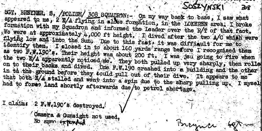Wkrótce do polskich pilotów dotarła wiadomość, że celem ataku Luftwaffe stały się alianckie lotniska. Zanim jednak nad nie dotarli, zauważyli oznakę obecności nieprzyjaciela – ostrzał sojuszniczej artylerii przeciwlotniczej. Lecący na wysokości 4000 stóp sierż. Stanisław Breyner w okolicach Lokeren – miasta położonego ok. 25 km na północny wschód od St. Denijs-Westrem – natknął się na parę niemieckich samolotów Fw 190. Wziął na cel jeden z nich i już miał nacisnąć spust, gdy obaj przeciwnicy weszli w gwałtowne wznoszenie, aby zaraz obrócić swoje maszyny na plecy i zanurkować. Być może szybkie półbeczki nie były zamierzone, a stanowiły efekt zbyt gwałtownego manewru. Gdy już znalazły się w nurkowaniu, nie było szans na ratunek, ponieważ znajdowały się na wysokości ledwie 60 m. Oba samoloty rozbiły się, a ich piloci – hptm. Bottländer i ofw. Eckert – najprawdopodobniej zginęli. Mimo że sierż. Breyner nie oddał ani jednego strzału, dwa zestrzelenia zostały mu zaliczone. Wkrótce potem z powodu braku paliwa awaryjnie lądował.