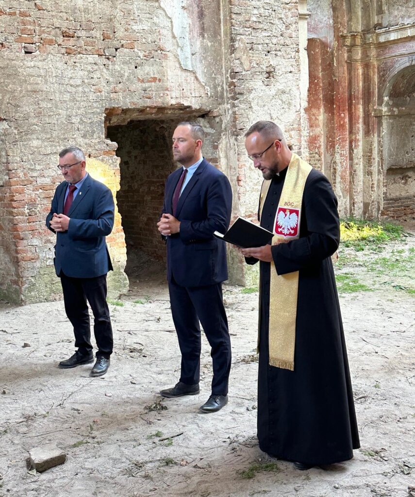 Karol Nawrocki stawia pod ścianą niewielki krzyż, Leon Popek opowiada o historii tego miejsca, a ks. Tomasz Trzaska rozpoczyna modlitwę. „Wieczny odpoczynek racz im dać, Panie!”. Przejmująca cisza. Na ścianach ruin świątyni gdzieniegdzie widać zachowane freski. Obok kościoła stoi niewielki pomnik poświęcony pomordowanym Polakom, na którym wypisano nazwiska tych, którzy wówczas ginęli. Przy każdym nazwisku wiek ofiary. Umieszczamy pod pomnikiem wieniec i zapalamy znicze. Mijają nas miejscowi, dyskretnie się witając.