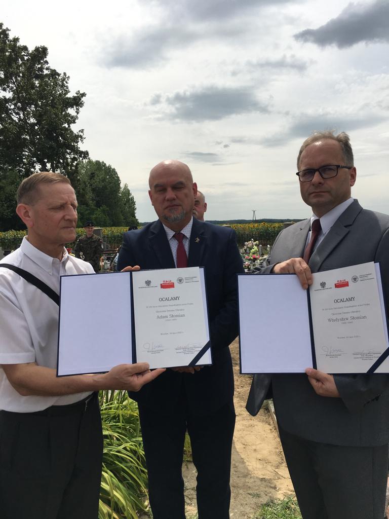 Naczelnik Oddziałowego Biura Upamiętniania Walk i Męczeństwa IPN we Wrocławiu Wojciech Trębacz, zwracając się do zebranych, podkreślił wyjątkowość każdej z przynajmniej kilkudziesięciu dotychczas zorganizowanych uroczystości w ramach projektu Ocalamy - przedsięwzięcia prowadzonego przez IPN i Dolnośląski Urząd Wojewódzki. Wicewojewoda Dolnośląski Jarosław Kresa podziękował rodzinie bohaterów projektu i podkreślił jego znaczenie, daleko wykraczające znaczeniem poza społeczności lokalne. Głos zabrali jeszcze: Tytus Czartoryski – radny Sejmiku Województwa Dolnośląskiego, Józef Słomian – syn Adama Słomiana, w imieniu licznie zgromadzonej rodziny oraz proboszcz miejscowej parafii ks. Adam Prorok. Spotkanie w dniu 24 lipca 2023 r. zostało przygotowane przez pracowników OBUWiM: Przemysława Mandelę, Wojciecha Trębacza i Renatę Winiarską oraz radnego Sejmiku Województwa Dolnośląskiego Damiana Mrozka.