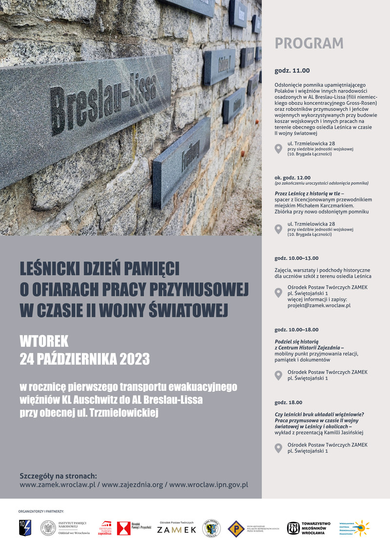 11.00 – odsłonięcie pomnika upamiętniającego Polaków i więźniów innych narodowości osadzonych w AL Breslau-Lissa (filii niemieckiego obozu koncentracyjnego Gross-Rosen) oraz robotników przymusowych i jeńców wojennych wykorzystywanych przy budowie koszar wojskowych i innych pracach na terenie obecnego osiedla Leśnica w czasie II wojny światowej
