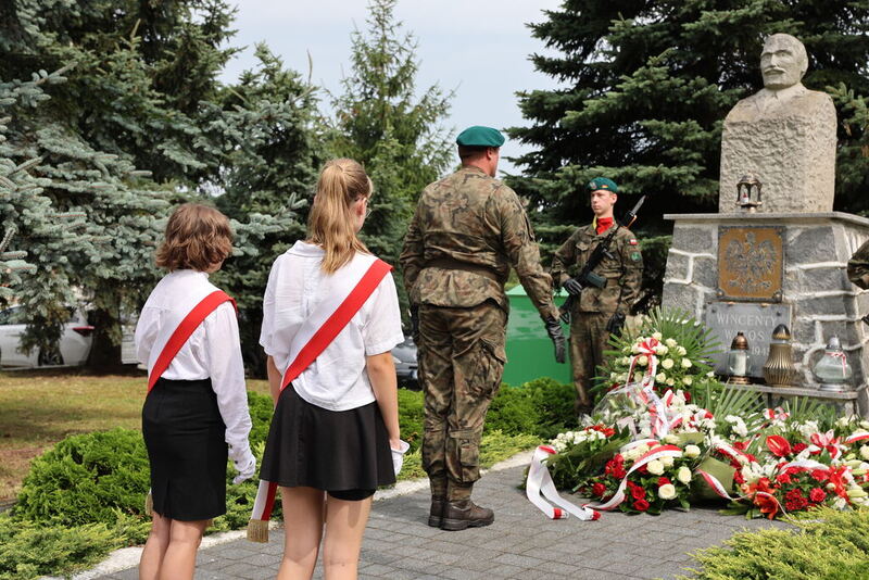 Uczestnicy złożyli biało-czerwone wiązanki kwiatów przed pomnikiem Wincentego Witosa.