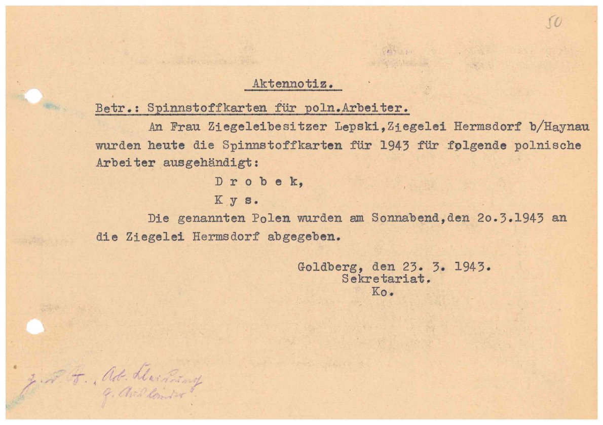 Fot. 3. Berg- und Hütten- Aktiongesellschaft Buhag Bergwerksdirektion Goldberg, Notatka dot. kart wyposażenia w tekstylia dla polskich robotników przymusowych przekazanych do dyspozycji właścicielki cegielni w m. Hermsdorf, 23 III 1943 r., sygn. IPN Wr 4/5. -