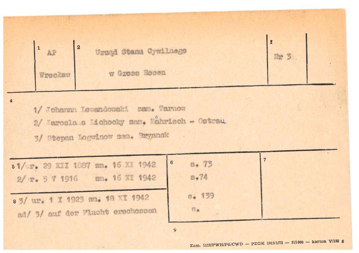 Fot. 4. Okręgowa Komisja Badania Zbrodni Hitlerowskich we Wrocławiu, Kartoteka pomocnicza dot. osób zmarłych w obozie koncentracyjnym Gross-Rosen sporządzona na podstawie kwerendy w księgach zgonów więźniów obozu za 1942 r. (t. 4-6) prowadzonych przez Standesamt Gross-Rosen, przechowywanych w Archiwum Państwowym we Wrocławiu, sygn. IPN Wr 5/7. -