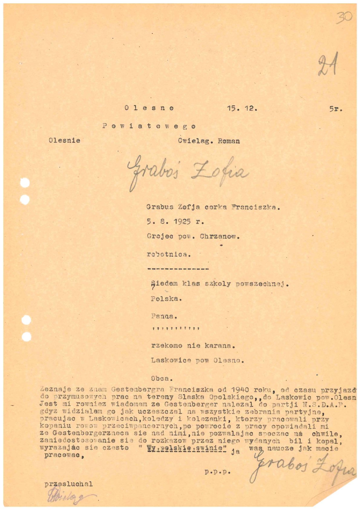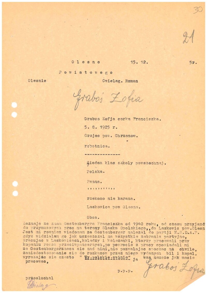 Fot. 8. Powiatowy Urząd Bezpieczeństwa Publicznego w Oleśnie, Protokół przesłuchania świadka Zofii Graboś, 15 XII 1945 r., sygn. IPN Wr 012/625