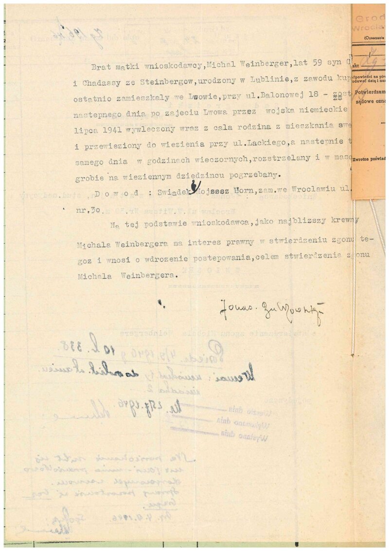 Fot. 7. Sąd Grodzki we Wrocławiu, Fragment wniosku Jonasa Bulkowsztajna o stwierdzenie zgonu Michała Weinbergera, 24 VII 1946 r., sygn. IPN Wr 15/204. -