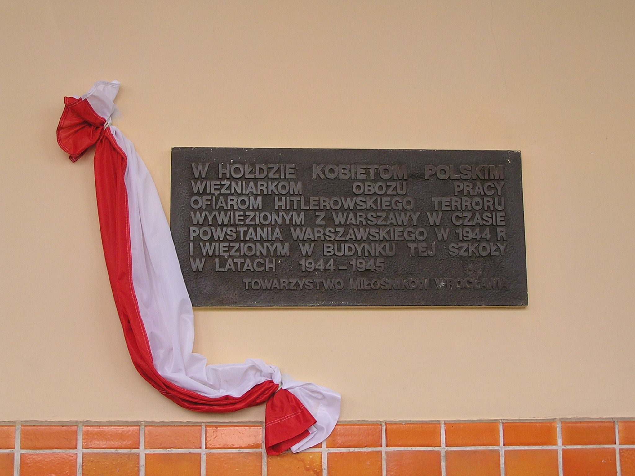 Budynek będący obecnie siedzibą Zespołu Szkół nr 9 – obejmującego Szkołę Podstawową nr 45 im. Janusza Kusocińskiego oraz Ogólnokształcącą Szkołę Muzyczną I stopnia nr 2 im. Fryderyka Chopina – to gmach o przedwojennej metryce. Wznoszony w latach 1927–1928 i otwarty w Wielkanoc 1928 roku, do przełomu 1944 i 1945 roku był siedzibą miejskiej Szkoły Ludowej im. Friedricha Eberta (Friedrich Ebert Schule). W sierpniu 1944 roku w gmachu tej szkoły utworzono zbiorczy obóz pracy dla cywilnej ludności deportowanej z powstańczej Warszawy. W większości były to kobiety z dziećmi w różnym wieku – w sumie przynajmniej 800 osób. Pomieszczenia obozowe znajdowały się w parterowej części budynku, w dwóch dużych salach gimnastycznych oraz w kilku pomieszczeniach pomocniczych. Warunki bytowe i sanitarne były dramatyczne. Sale były przepełnione, nieogrzewane. Szerzyły się choroby i epidemie, które obok głodowych racji żywnościowych stanowiły główną przyczynę zgonu dzieci. Kobiety pracowały m.in. w pobliskich zakładach pracy. Obowiązek pracy obejmował także dzieci w wieku od dziesiątego roku życia, te młodsze zajmowały się natomiast czyszczeniem obozowych toalet. Obóz funkcjonował aż do końca wojny, ale w czasie oblężenia miasta zmienił swoje przeznaczenie. Pod koniec stycznia 1945 roku większość kobiet wraz z dziećmi została przeniesiona do innych obozów, a na terenie szkoły zakwaterowano mężczyzn, którzy pracowali m.in. na pobliskiej budowie lotniska w rejonie dzisiejszego placu Grunwaldzkiego. O ciemnej karcie dziejów tego obiektu przypominają dwie tablice pamiątkowe zainicjowane przez Klub Ludzi ze Znakiem P i ufundowane przez Towarzystwo Miłośników Wrocławia. W maju 1976 roku odsłonięto tablicę na I piętrze budynku, natomiast w kwietniu 1986 roku – cegiełkę na elewacji jednej z sal gimnastycznych.