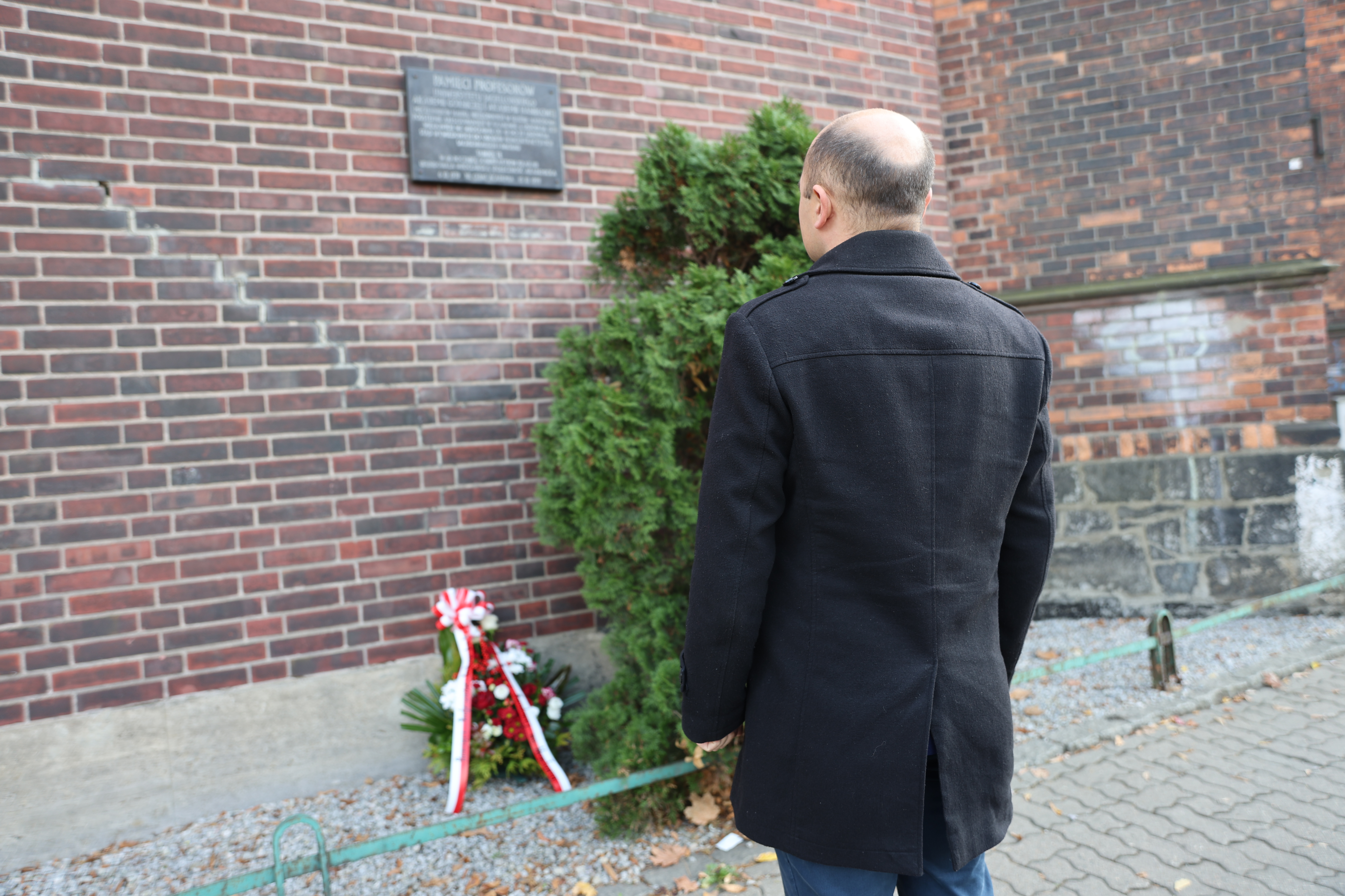 Dyrektor Oddziału IPN we Wrocławiu dr hab. Kamil Dworaczek przed tablicą Profesorów krakowskich na murze aresztu śledczego przy ul. Sądowej, 6 listopada 2024 roku. Fot. Maciej Parysek / IPN Wrocław -