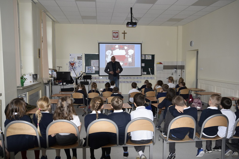 Dzieci zapoznały się również z mapą Polski i Europy na przestrzeni wieków oraz nieoczywistymi postaciami zwierząt, które zapisały się w historii naszego kraju. Spotkanie miało na celu rozwijanie wśród uczniów poczucia przynależności narodowej, pielęgnowanie polskiej kultury i tradycji, stając się kolorową lekcją historii i patriotyzmu. Na zakończenie, w dowód wdzięczności uczniowie wręczyli historykowi własnoręcznie wykonaną laurkę, którą jak sam obiecał postawi na honorowym miejscu w swoim biurze.