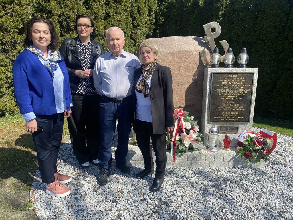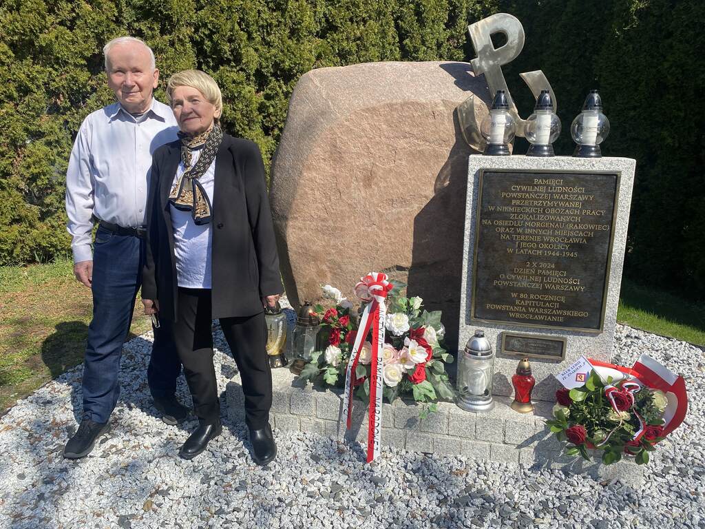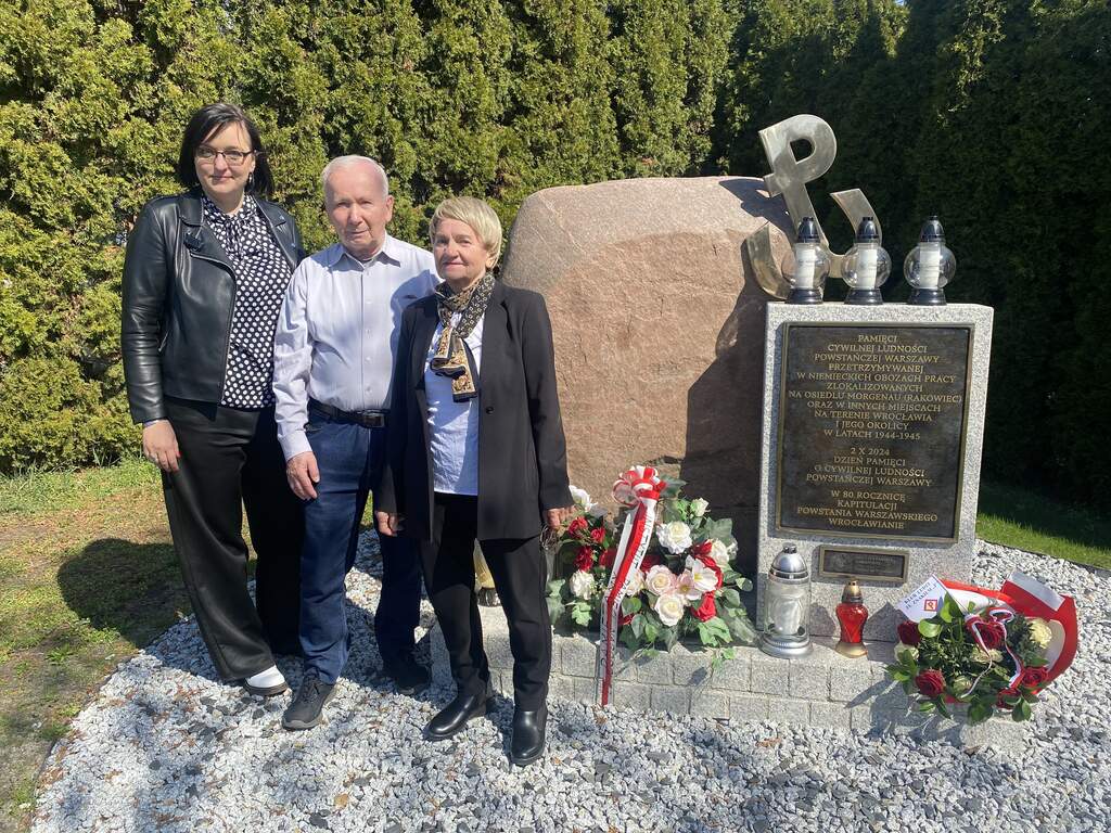 Ostatnim miejscem pamięci odwiedzonym w tym tygodniu w ramach akcji był pomnik cywilnej ludności powstańczej Warszawy deportowanej do wojennego Wrocławia w trakcie i po powstaniu warszawskim. U zbiegu ulic Rakowieckiej i na Niskich Łąkach pomnik ten wzniósł jesienią 2024 roku Oddział IPN we Wrocławiu. Tym razem Klub Ludzi ze Znakiem P reprezentowali Maria Grzyb i Zygmunt Pacych, zaś w imieniu Oddziału IPN kwiaty złożyła i znicz zapaliła Kamilla Jasińska, inicjatorka wzniesienia tego pomnika i współautorka jego koncepcji [więcej na temat pomnika i jego uroczystego odsłonięcia tutaj TUTAJ].