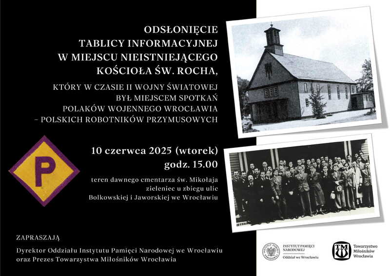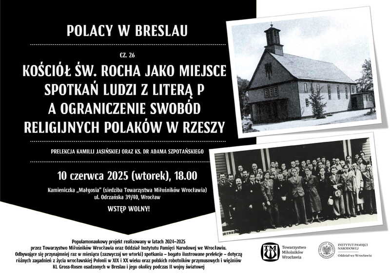 Tego samego dnia, 10 czerwca o godz. 18.00, w kamieniczce "Małgosia" przy ul. Odrzańskiej 39/40 odbędzie się 26. prelekcja z cyklu "Polacy w Breslau". O kościele św. Rocha jako miejscu spotkań Polaków wojennego Wrocławia, a także o opiece religijnej i ograniczaniu przez III Rzeszę swobód religijnych w czasie II wojny światowej opowiedzą Kamilla Jasińska i ks. dr Adam Szpotański. Na oba wydarzenia wstęp wolny. Zapraszamy!