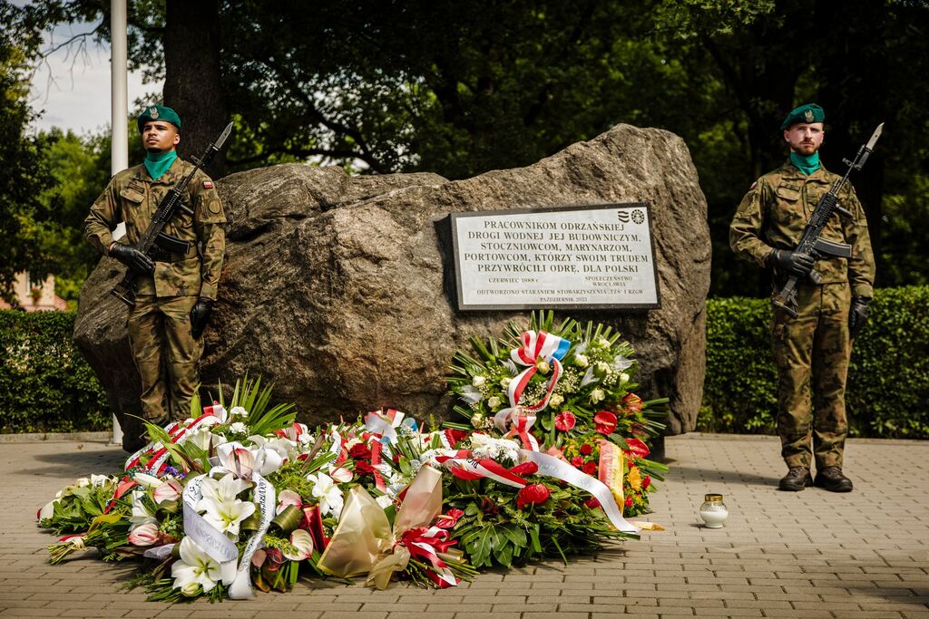 Następnie pod Pomnikiem Pionierów Odry przy ul. Kochanowskiego 92 odbyły się przemówienia okolicznościowe, Apel Pamięci i złożenie kwiatów. W gronie uczestników znalazł się dyrektor wrocławskiego Oddziału IPN dr hab. Kamil Dworaczek, Monika Niemiec-Butryn, pełniąca funkcję Zastępcy Dyrektora Departamentu Gospodarki Morskiej i Żeglugi Śródlądowej w Ministerstwie Infrastruktury. Wody Polskie reprezentowali: Stanisław Longawa, Dyrektor Regionalnego Zarządu Gospodarki Wodnej we Wrocławiu, oraz Arkadiusz Szkudlarek, Dyrektor tamtejszego Zarządu Zlewni. Wszyscy zabrali głos podczas uroczystości, oddając hołd marynarzom poprzez okolicznościowe przemówienia oraz złożenie wieńców i kwiatów przy pomniku.