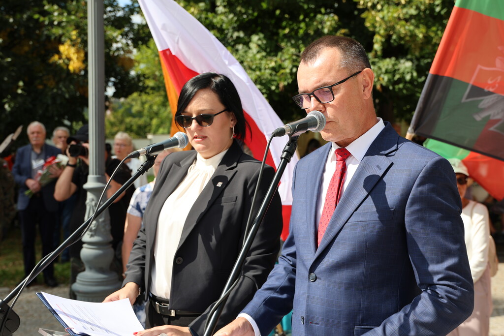 Gospodarz uroczystości dr hab. Kamil Dworaczek w ramach swoich dwóch wystąpień odczytał list, jaki do uczestników dzisiejszego wydarzenia skierował Karol Nawrocki, Prezydent RP. Historyk podkreślił także rolę Solidarności w kształtowaniu tożsamości mieszkańców miasta. Podziękował również władzom związku, miasta oraz parafii za zaangażowanie w budowę pomnika.
