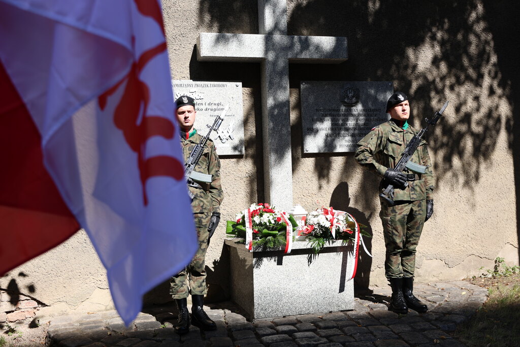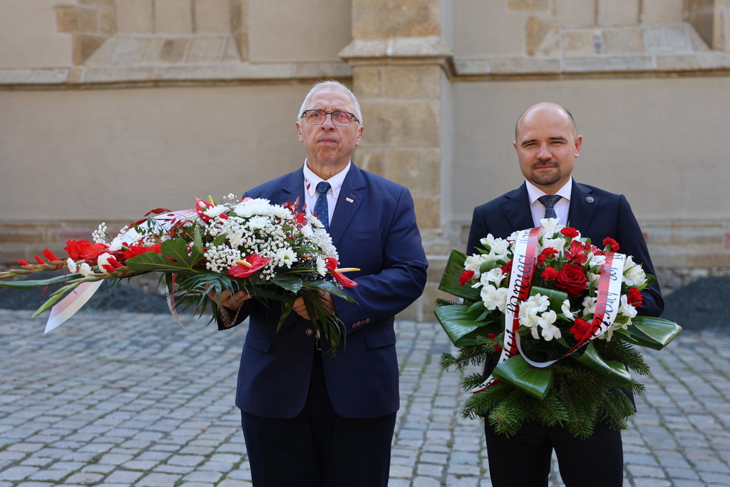 Chwilę przed mszą świętą, dyrektor wrocławskiego Oddziału IPN dr hab. Kamil Dworaczek oraz przewodniczący NSZZ "Solidarność" Regionu Jeleniogórskiego Franciszek Kopeć, złożyli wiązanki kwiatów pod tablicą poświęconą powstaniu NSZZ.