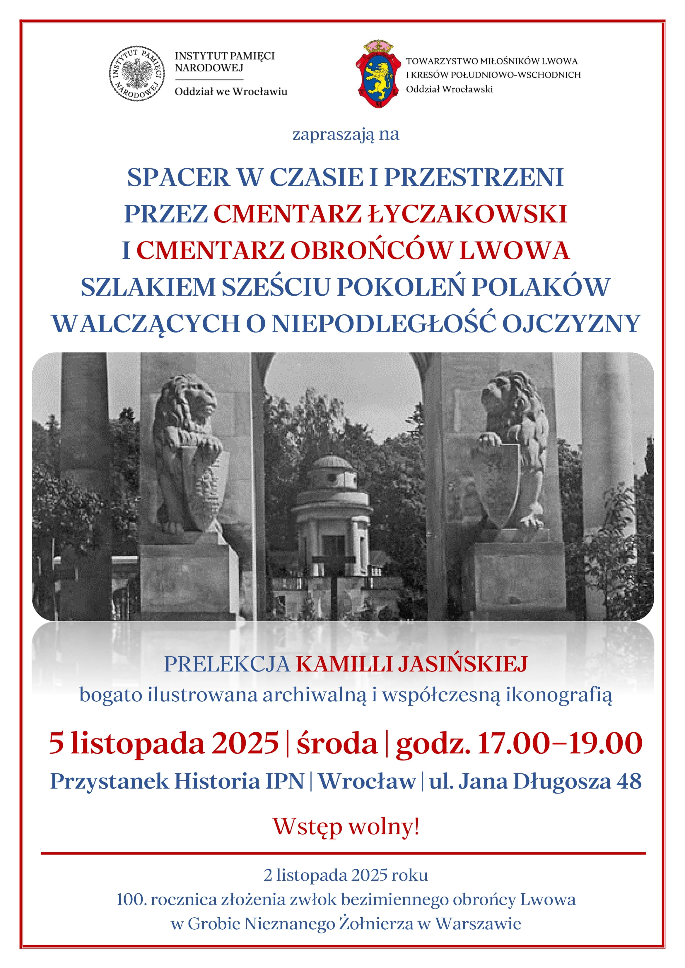 Z okazji przypadającej 2 listopada tego roku setnej rocznicy złożenia zwłok bezimiennego obrońcy Lwowa w Grobie Nieznanego Żołnierza w Warszawie, Oddział IPN we Wrocławiu oraz Oddział Wrocławski Towarzystwa Miłośników Lwowa i Kresów Południowo-Wschodnich zapraszają na nietypowy spacer po niezwykłej lwowskiej nekropolii – Cmentarzu Łyczakowskim, którego częścią jest Cmentarz Obrońców Lwowa. W środę 5 listopada prelekcję – bogato ilustrowaną archiwalną ikonografią – przedstawi Kamilla Jasińska.