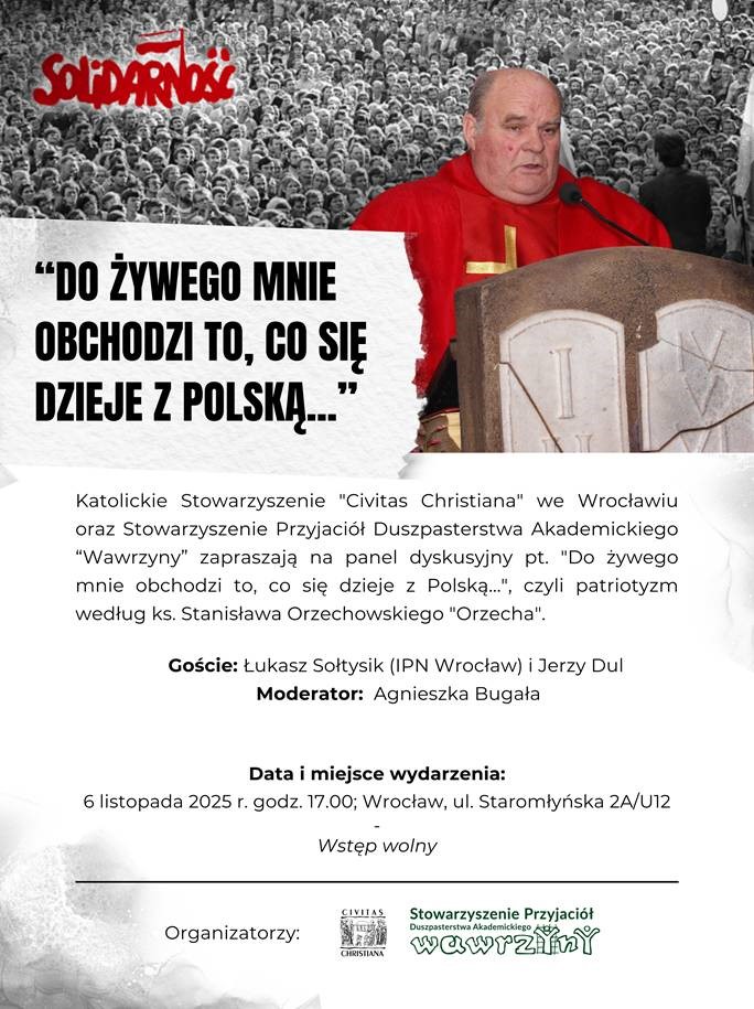 W przeddzień kolejnej rocznicy urodzin śp. ks. Stanisława Orzechowskiego „Orzecha”, m.in. wieloletniego kapelana wrocławskiej „Solidarności”, Katolickie Stowarzyszenie „Civitas Christiana” wraz z Stowarzyszeniem Przyjaciół Duszpasterstwa Akademickiego „Wawrzyny” zaprasza na panel dyskusyjny „Do żywego mnie obchodzi to, co się dzieje z Polską…” czyli patriotyzm wg ks. Stanisława Orzechowskiego „Orzecha”.