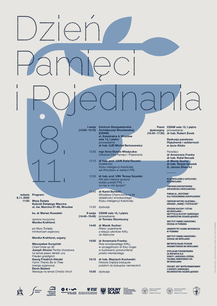 Zapraszamy na Dzień Pamięci i Pojednania 2025, którego myślą przewodnią jest nawiązanie do Listu biskupów polskich do biskupów niemieckich (18 listopada 1965 r.) oraz do roli, jaką wrocławski Klub Inteligencji Katolickiej odegrał w procesie pojednania polsko-niemieckiego i przemian społecznych w Polsce – w tym w powstaniu „Solidarności”.
