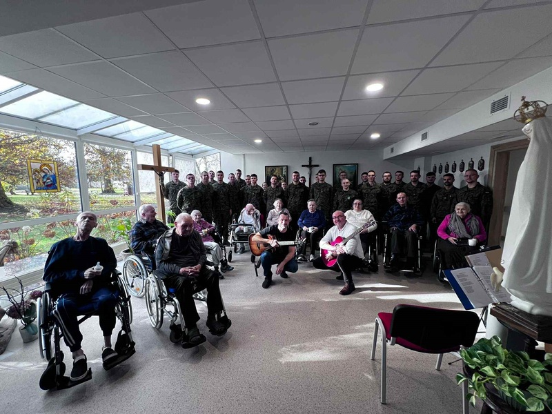 Wydarzenie uświetnił także występ i śpiew podchorążych Akademii Wojsk Lądowych, którzy wnieśli w to spotkanie wyjątkową, pełną emocji atmosferę. Był to czas uśmiechu, wzruszeń i wspólnego świętowania – chwila refleksji nad historią oraz wolnością, którą dziś możemy się cieszyć. Serdecznie dziękujemy za ciepłe przyjęcie i możliwość towarzyszenia podopiecznym hospicjum w tym szczególnym dniu.