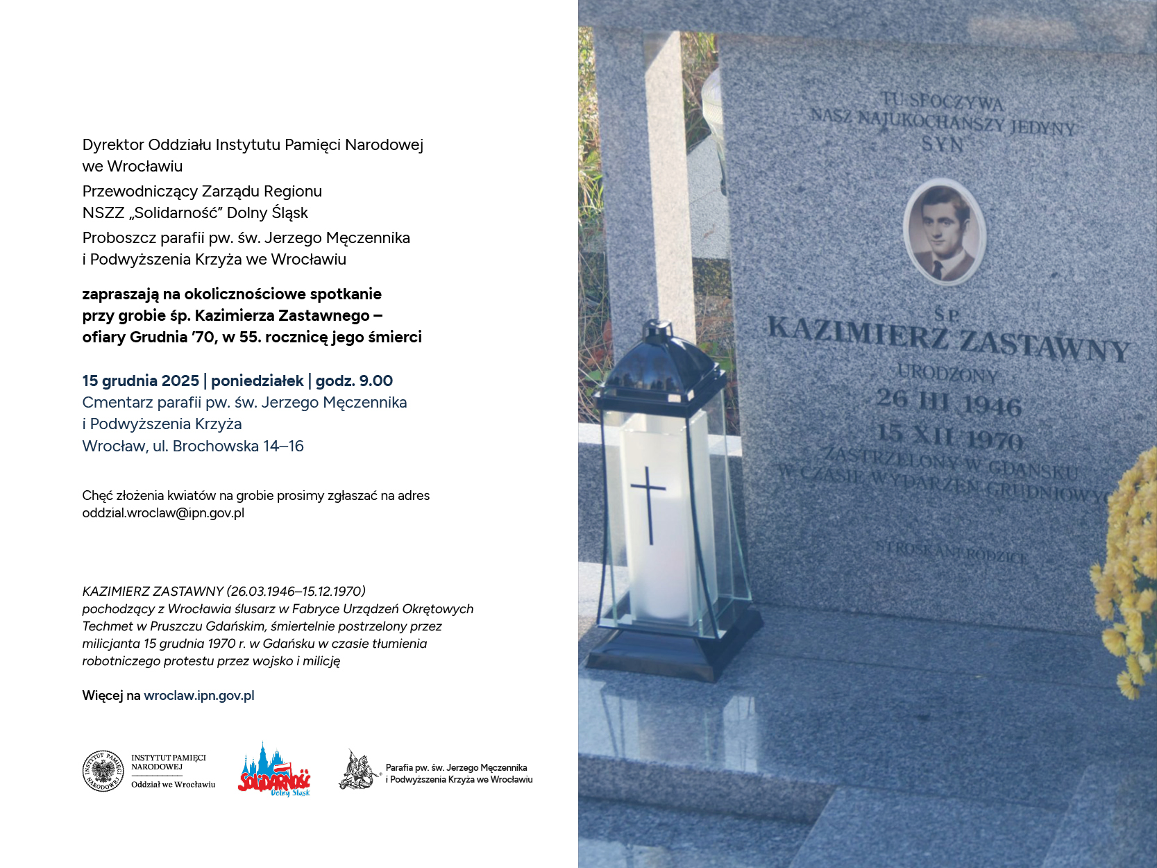 Dyrektor Oddziału Instytutu Pamięci Narodowej we Wrocławiu, Przewodniczący Zarządu Regionu NSZZ „Solidarność” Dolny Śląsk oraz Proboszcz parafii pw. św. Jerzego Męczennika i Podwyższenia Krzyża we Wrocławiu zapraszają na okolicznościowe spotkanie przy grobie śp. Kazimierza Zastawnego – ofiary Grudnia ’70, w 55. rocznicę jego śmierci.
