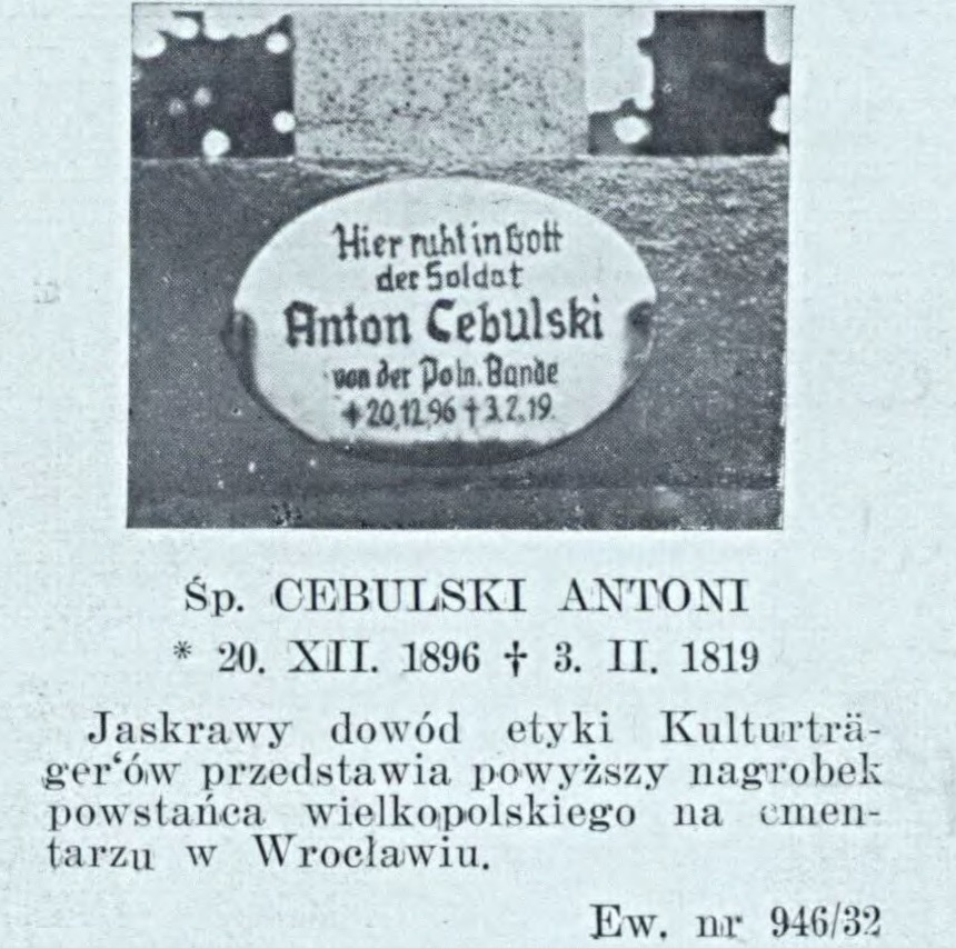Faktem jest, że po śmierci wcale nie pozostawiono jego grobu w spokoju, a stał się on wygodnym obiektem do wprowadzania w życie elementów antypolskiej kampanii powojennych władz niemieckiego Wrocławia. W drugiej połowie lat 30. XX wieku Władysław Zarembowicz – polski harcerz i działacz wrocławskiej Polonii – wykonał chyba najbardziej znane zdjęcie omawianej mogiły. Przedstawiało ono zbliżenie na krzyż z umieszczoną na nim emaliowaną tabliczką z napisem: „Hier ruht in Gott der Soldat Anton Cebulski” (tłum. Tutaj spoczywa w Panu żołnierz Anton Cebulski). Pomiędzy nazwiskiem a latami życia umieszczono dopisek: Von der Poln. Bande (tłum. Z polskiej bandy). Niewykluczone, że dopisek ten powstał po 1933 roku, gdy niemieckie prześladowania dotknęły nie tylko ludność polską zamieszkałą na terenie Niemiec, ale nie ominęły także grobów Polaków ważnych dla polskiej historii. Fotografia ta znalazła się wydanym w 1939 roku szóstym numerze „Albumu Pamiątkowego Powstańców i Niepodległościowców Ziem Zachodnich RP”.