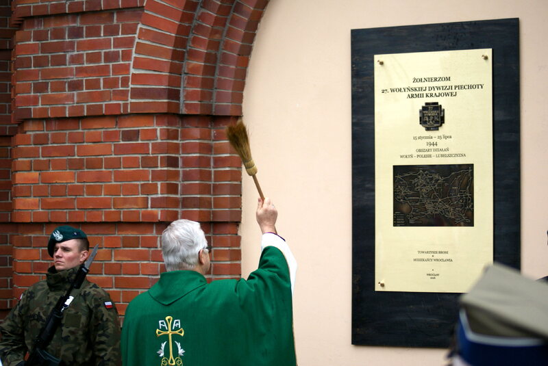 W 2026 r. minie dziesięć lat, od chwili, gdy 27. Wołyńska Dywizja Piechoty Armii Krajowej została upamiętniona we Wrocławiu. Pomysłodawcą i wielkim orędownikiem powstania w przestrzeni publicznej stolicy Dolnego Śląska znaku pamięci poświęconego jej żołnierzom był prof. Henryk Słowiński, prezes wrocławskiego środowiska żołnierzy 27. Wołyńskiej Dywizji AK. Tablica powstała we współpracy z władzami samorządowymi Wrocławia oraz parafią pw. Maksymiliana Marii Kolbego we Wrocławiu. Dzięki uprzejmości ks. prałata Czesława Majdy, ówczesnego proboszcza tej parafii, tablicę umieszczono na wschodniej elewacji kościoła, tj. od strony ul. Na Ostatnim Groszu. Uroczyste odsłonięcie odbyło się w niedzielę 6 listopada 2016 r. Od tego czasu w połowie stycznia każdego roku w kościele na Gądowie sprawowana jest uroczysta msza święta, po której pod tablicą składane są kwiaty. Fotorelację z uroczystego odsłonięcia tablicy można obejrzeć na stronie parafii: https://mkolbe.wroclaw.pl/galeria-zdjec/msza-sw-i-tablica-pam-27-dywizja-wolynska.