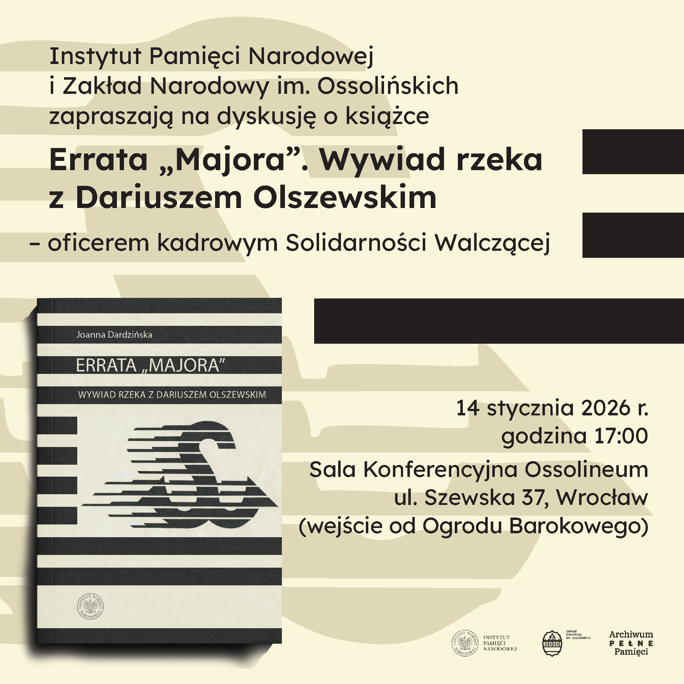 Instytut Pamięci Narodowej i Zakład Narodowy im. Ossolińskich zapraszają na prezentację książki wydanej nakładem Wydawnictwa IPN w ramach projektu Archiwum IPN „Archiwum Pełne Pamięci”: Errata „Majora”. Wywiad rzeka z Dariuszem Olszewskim – oficerem kadrowym Solidarności Walczącej.