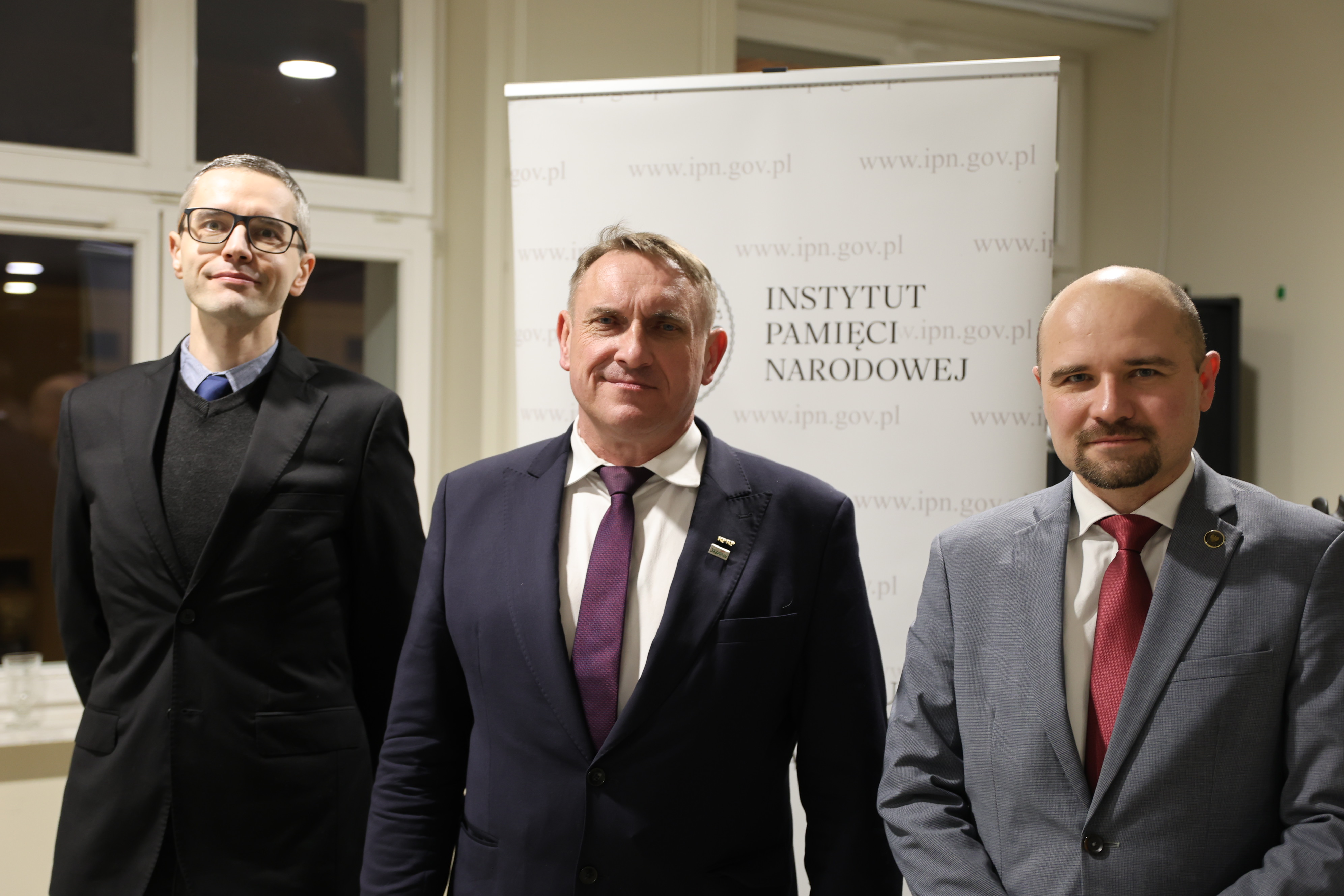 zdjęcie pamiątkowe, trzy osoby stojące na tle rollupa IPN