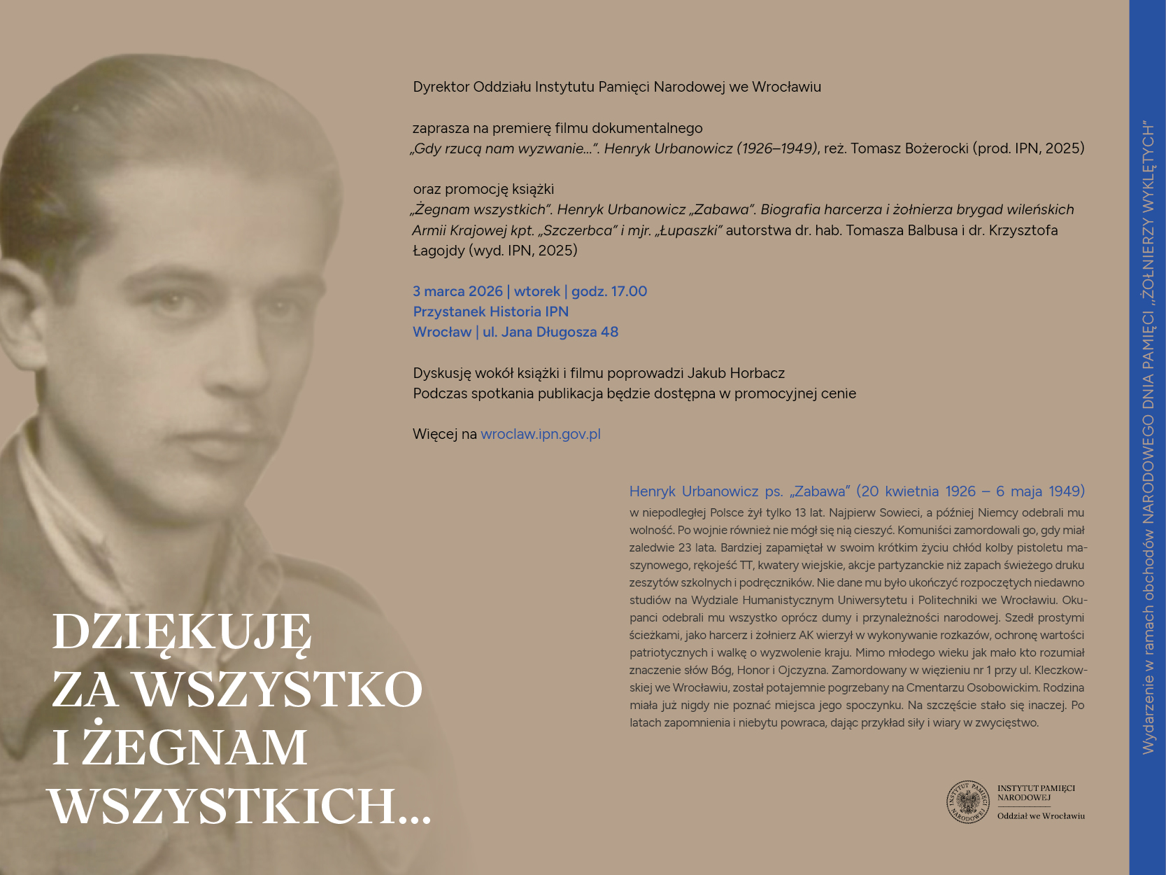 „Dziękuję za wszystko i żegnam wszystkich” to wydarzenie, w ramach którego odbędzie się premiera filmu dokumentalnego „«Gdy rzucą nam wyzwanie…». Henryk Urbanowicz (1926–1949)”, w reż. Tomasza Bożerockiego (prod. IPN, 2025) oraz promocja książki „«Żegnam wszystkich». Henryk Urbanowicz «Zabawa». Biografia harcerza i żołnierza brygad wileńskich Armii Krajowej kpt. «Szczerbca» i mjr. «Łupaszki»” autorstwa dr. hab. Tomasza Balbusa i dr. Krzysztofa Łagojdy (wyd. IPN, 2025). Dyskusję wokół książki i filmu poprowadzi Jakub Horbacz. Podczas spotkania książka będzie dostępna w promocyjnej cenie, do nabycia będą także inne publikacje Wydawnictwa IPN. Zapraszamy we wtorek 3 marca na godz. 17.00 do Przystanku Historia IPN przy ul. Jana Długosza 48 we Wrocławiu. Wstęp wolny.