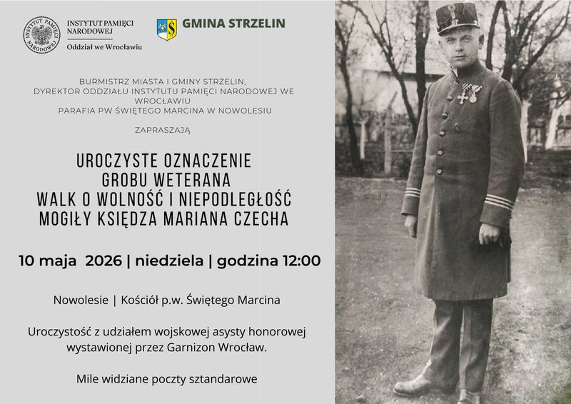 Instytut Pamięci Narodowej – Oddział we Wrocławiu zaprasza na uroczyste oznaczenie grobu ks. Mariana Czecha insygnium „Grób Weterana Walk o Wolność i Niepodległość Polski”. Wydarzenie odbędzie się 10 maja 2026 roku (niedziela) o godz. 12:00 na cmentarzu przy kościele Najświętszej Maryi Panny Różańcowej z Kresów w Nowolesiu w gminie Strzelin.