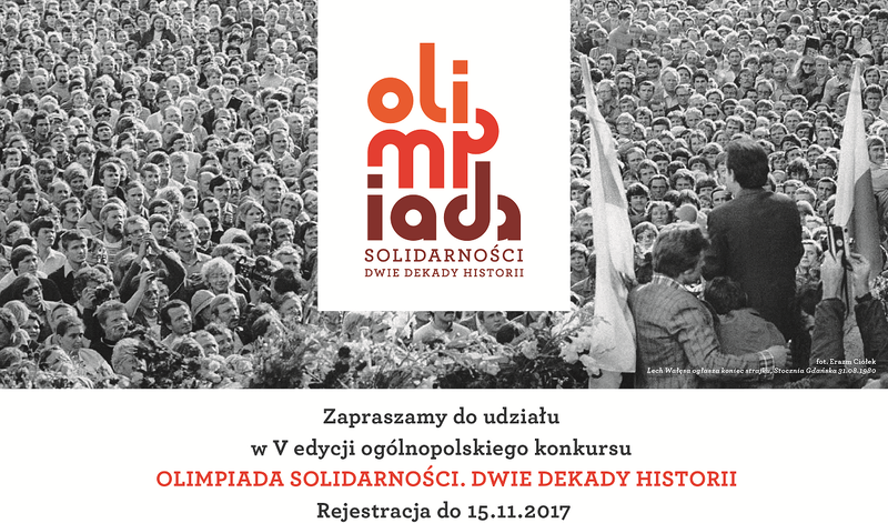 Do 15 listopada potrwa rejestracja szkół do V edycji konkursu „Olimpiada Solidarności. Dwie dekady historii”. Zgłoszenia można dokonywać poprzez formularz na stronie: http://olimpiadasolidarnosci.pl/formularz2017 Dla najlepszych drużyn przewidziane są indeksy na czołowe uczelnie wyższe w Polsce (m.in. Uniwersytet Warszawski i Uniwersytet Jagielloński), roczne stypendia naukowe oraz bony na wybrane publikacje IPN. Nagrody przewidziane są również dla nauczycieli (nagrody finansowe, bony do IPN) oraz szkół.