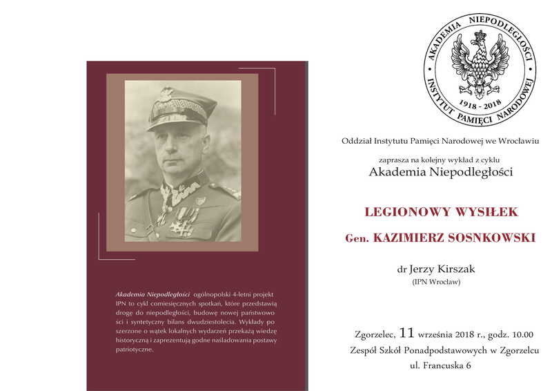 11 września 2018 roku w Zespole Szkół Ponadginazjalnych w Zgorzelcu (ul. Francuska 6) odbyło się kolejne spotkanie w ramach cyklu „Akademia Niepodległości". Wykład „Legionowy wysiłek. Gen. Kazimierz Sosnkowski” poprowadził dr Jerzy Kirszak (Oddziałowe Biuro Edukacji Narodowej IPN we Wrocławiu).