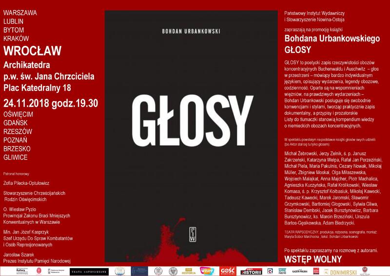 24 listopada o godz. 19.30 we wrocławskiej katedrze został wystawiony spektakl „Głosy”, oparty na dziele niezłomnego poety, prozaika, filozofa, historyka i publicysty Bohdana Urbankowskiego. To dokument zapisany wierszem. Wstrząsający opis piekła niemieckich obozów koncentracyjnych.
