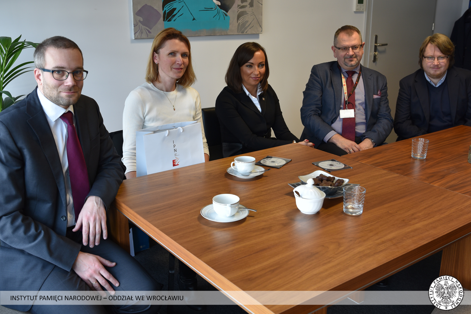 Czescy goście – jeszcze przed uroczystością w więzieniu przy ul. Kleczkowskiej – spotkali się z dr Katarzyną Pawlak-Weiss, zastępcą dyrektora Oddziału IPN we Wrocławiu, prof. Robertem Klementowskim, naczelnikiem Oddziałowego Biura Badań Historycznych IPN we Wrocławiu (OBBH) oraz dr. Dariuszem Dąbrowskim z OBBH, aby omówić perspektywy współpracy pomiędzy naszymi jednostkami i wymienić doświadczeniami w zakresie badań nad totalitaryzmami i ich ofiarami.