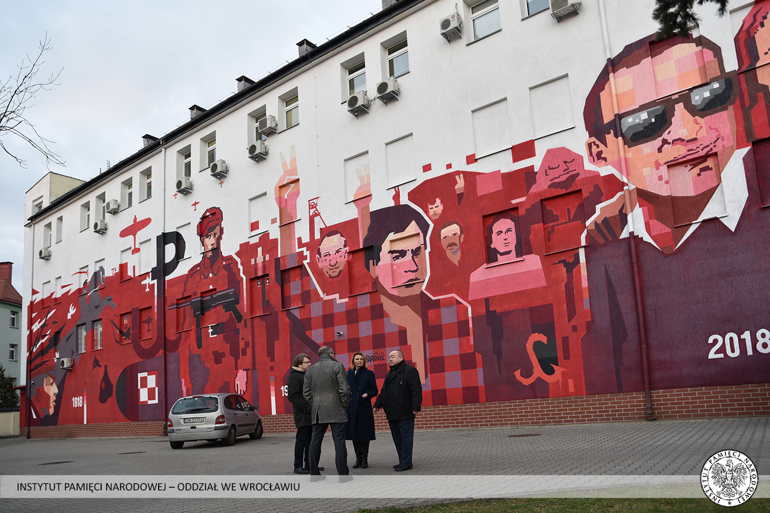 Po uroczystości upamiętniającej zamordowanych Czechów, Ondřej Matějka i dr Pavla Plachá w towarzystwie dr. Andrzeja Drogonia, dyrektora Oddziału IPN we Wrocławiu i dr. Dariusza Dąbrowskiego obejrzeli mural #PokoleniaNiepodległej na siedzibie Oddziałowego Archiwum IPN we Wrocławiu oraz pobieżnie zapoznali się z naszym zasobem.