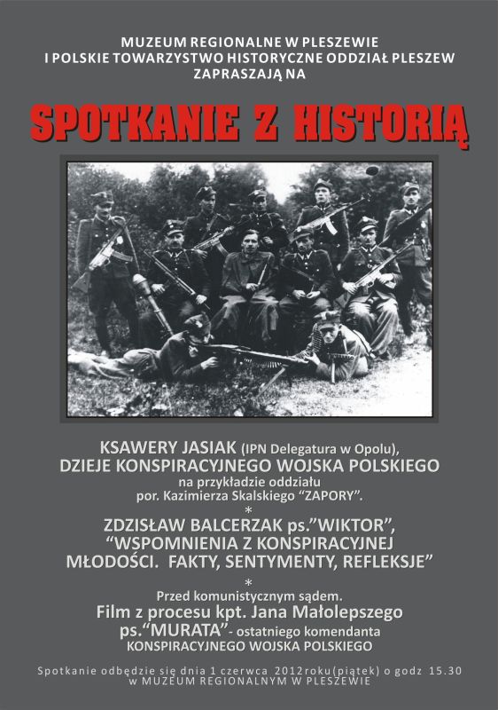 01/06/2012„Dzieje Konspiracyjnego Wojska Polskiego na przykładzie oddziału krypt. »Bałtyk« por. Kazimierza Skalskiego ps. »Zapora«” – wykład dr Ksawerego Jasiaka – Pleszew (woj. wielkopolskie), 1 czerwca 2012
