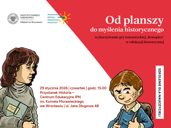 08/01/2026Dla nauczycieliGra towarzyska "Konspira". Szkolenie dla nauczycieli i edukatorów. Wszyscy zapisani uczestnicy otrzymają egzemplarz gry na własność oraz certyfikat - Przystanek Historia – Centrum Edukacyjne IPN im. Kornela Morawieckiego we Wrocławiu, 29 stycznia 2026