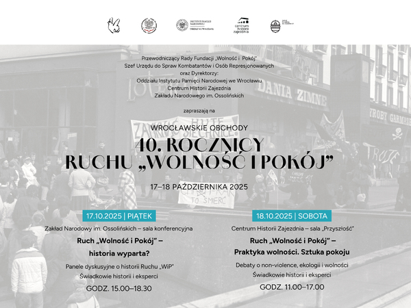 14/10/2025ZaproszenieWrocławskie obchody 40-lecia Ruchu „Wolność i Pokój”, jednego z najważniejszych nurtów opozycji antykomunistycznej w Polsce w drugiej połowie lat 80. XX wieku – Wrocław, 17–18 października 2025